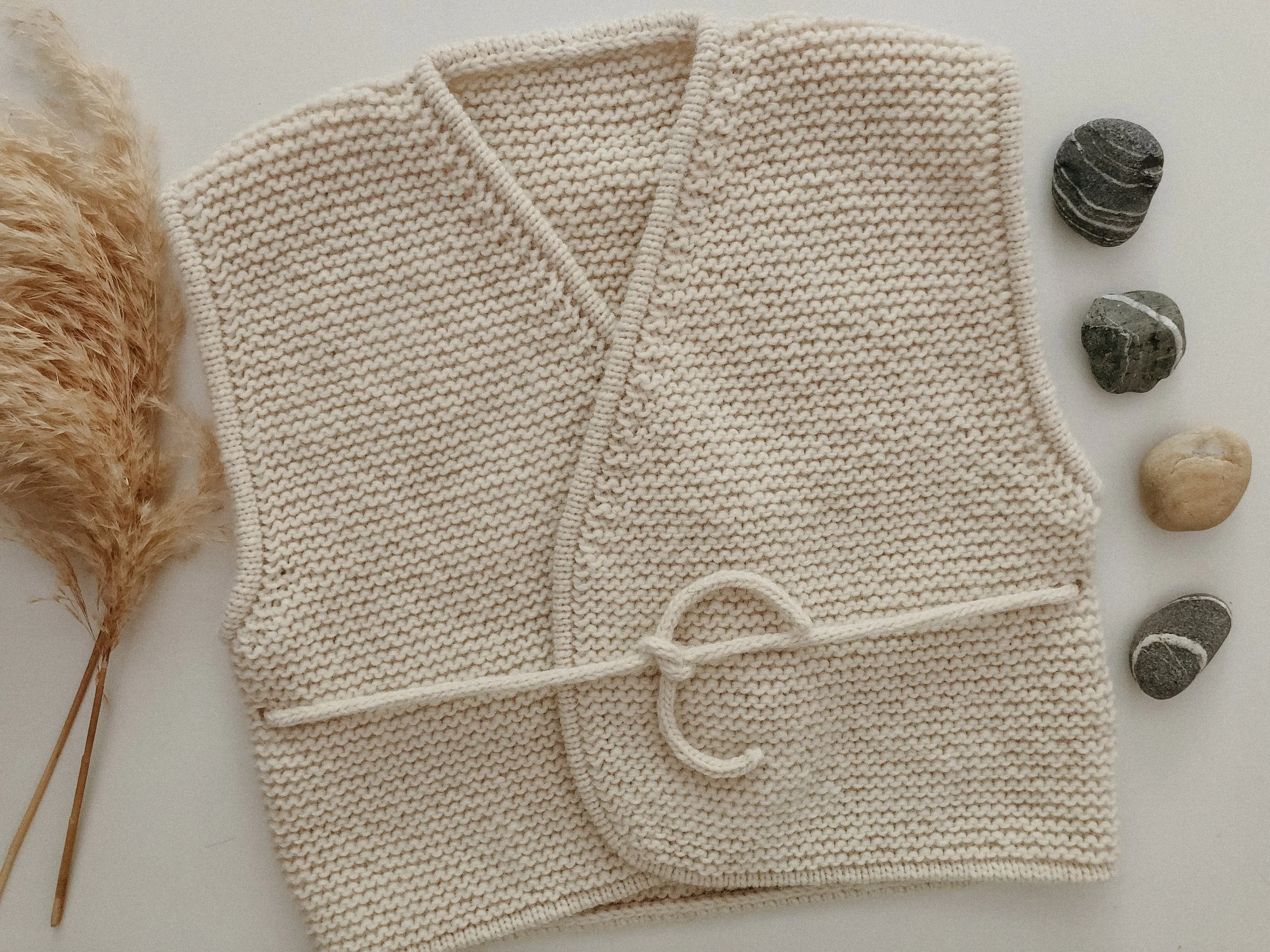 Knit in Garter Stitch, a classic and traditional knitting stitch, using Watershed from Hinterland Yarn, which is the softest mix of Alpaca and Rambouillet, the linear pattern is lofty and dense, with just enough detail. The vest has a capped sleeve, designed to fall off the shoulder a little, and it overlaps at the front, so you can wrap it tight or leave it looser. Eyelet holes are knit into each side to pass the knit belt through, so you can decide if you want to secure Cedar at the front or back, or leave the ties loose. And if all these details weren’t beautiful enough, the soft V-neck opening, and around the whole outside edge of the vest and armholes, are finished with exquisite knit binding. A true labour of love, from start to finish.